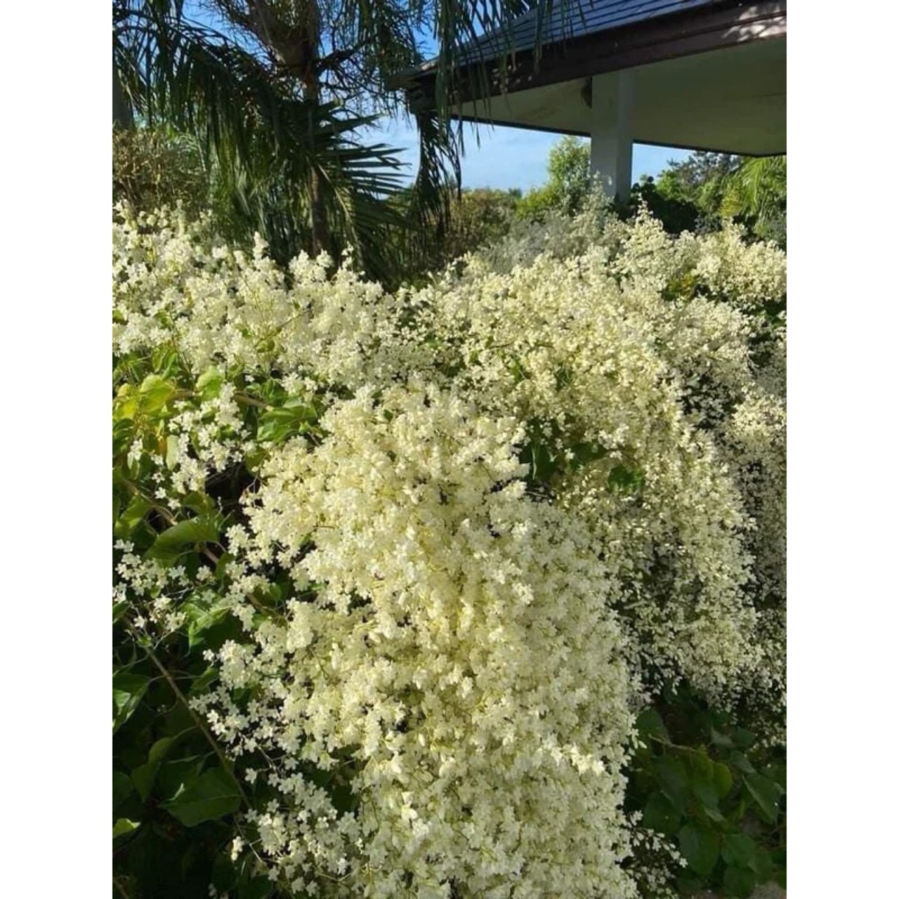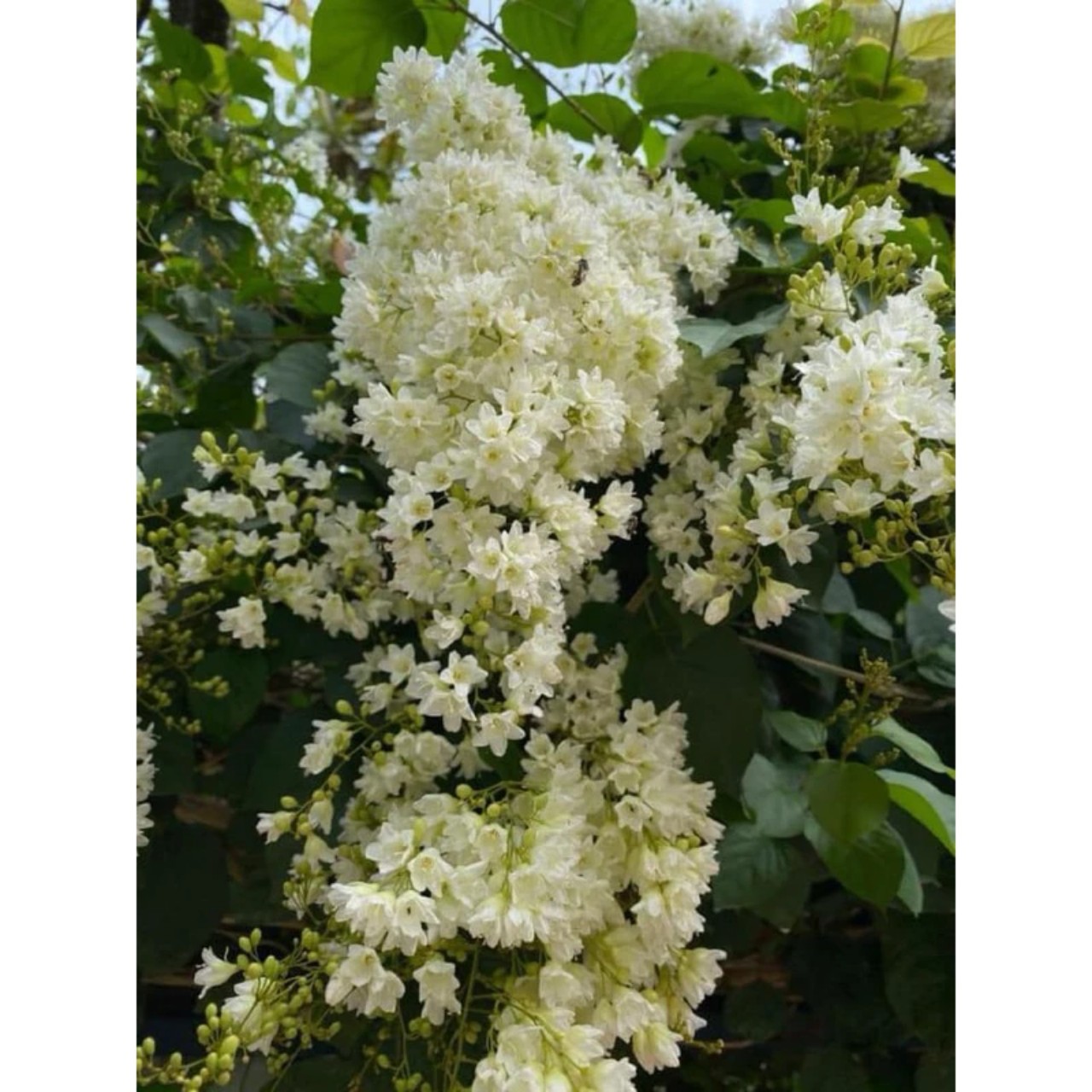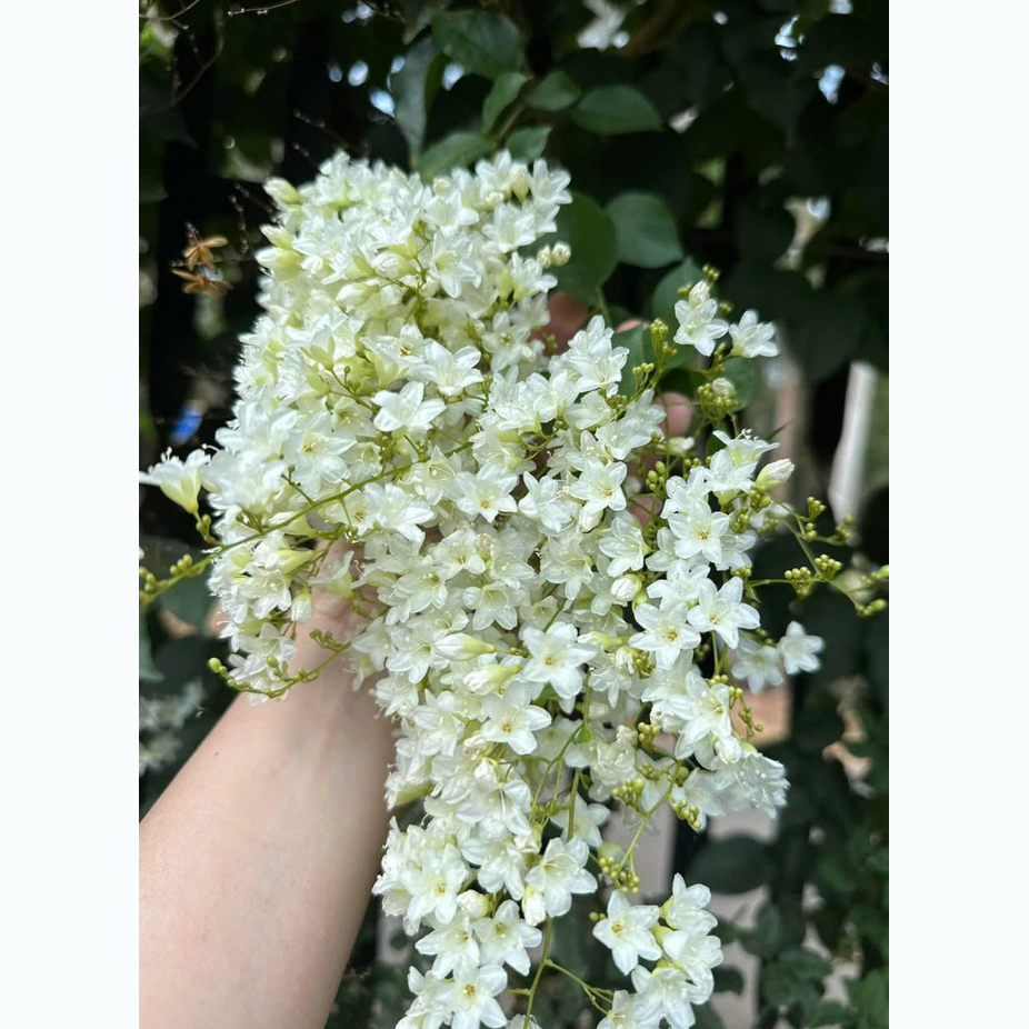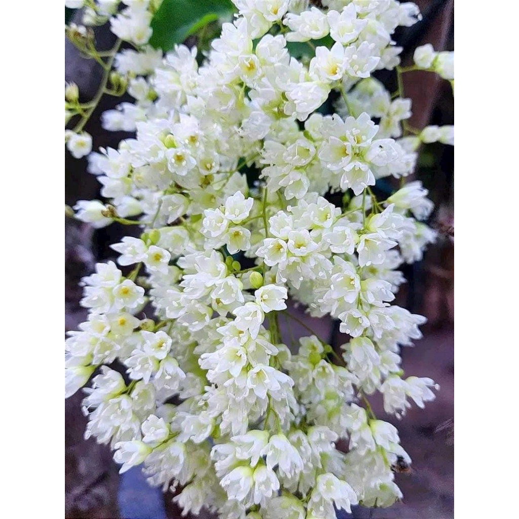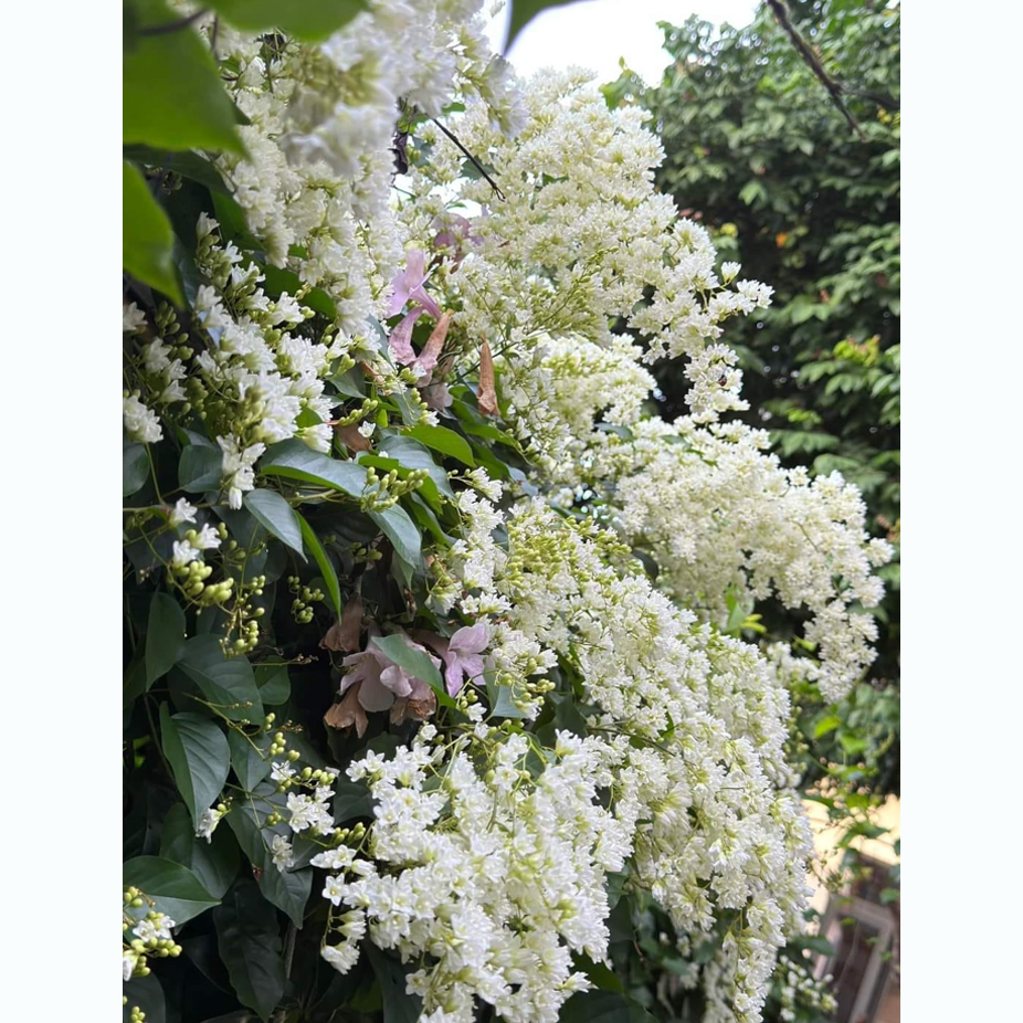 - Cây Đinh hương leo có những chùm hoa màu trắng kem thơm phức 5 cánh, nhụy trắng vươn lên trên cánh hoa.