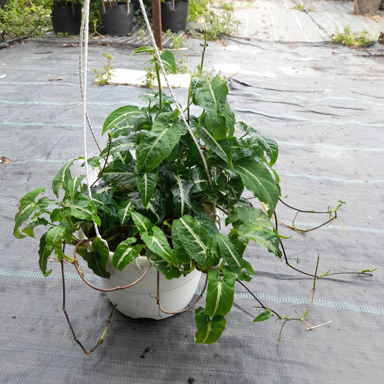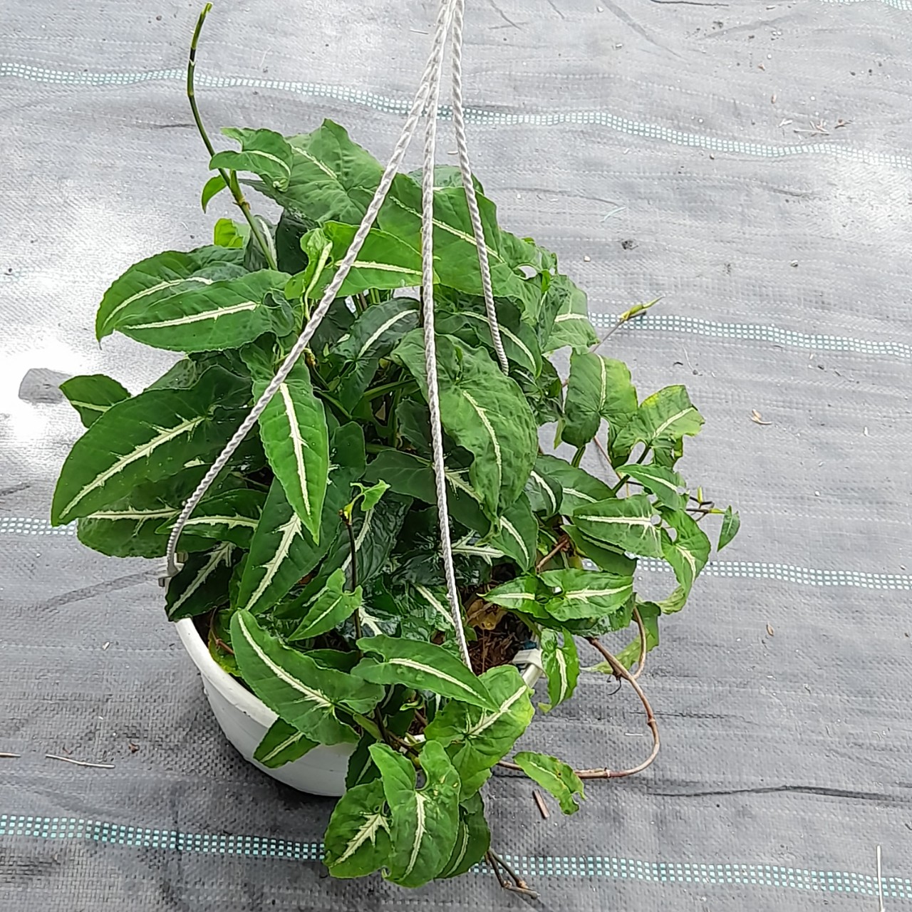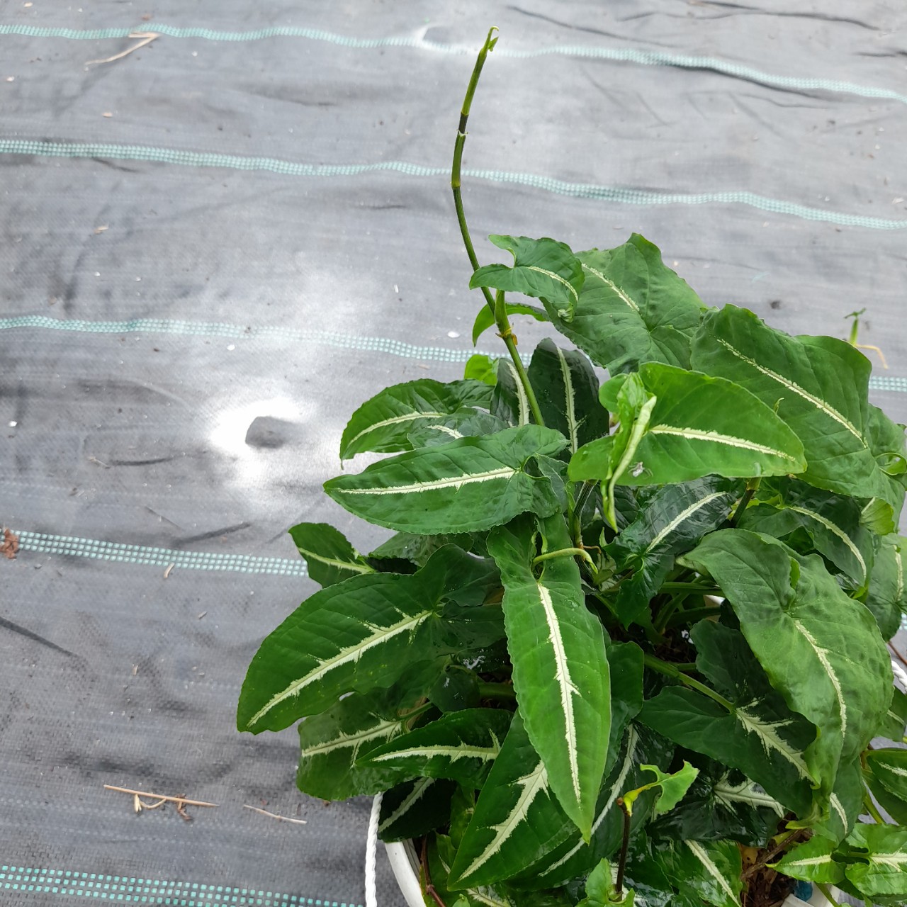 - Lá cây có hình tim, khi bắt đầu già đi chúng sẽ chuyển sang thành hình mũi tên và những gân trắng sẽ nhỏ lại. Mỗi lá có dạng mũi tên khác nhau, không thống nhất.